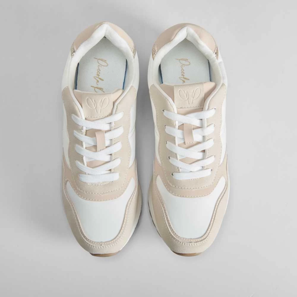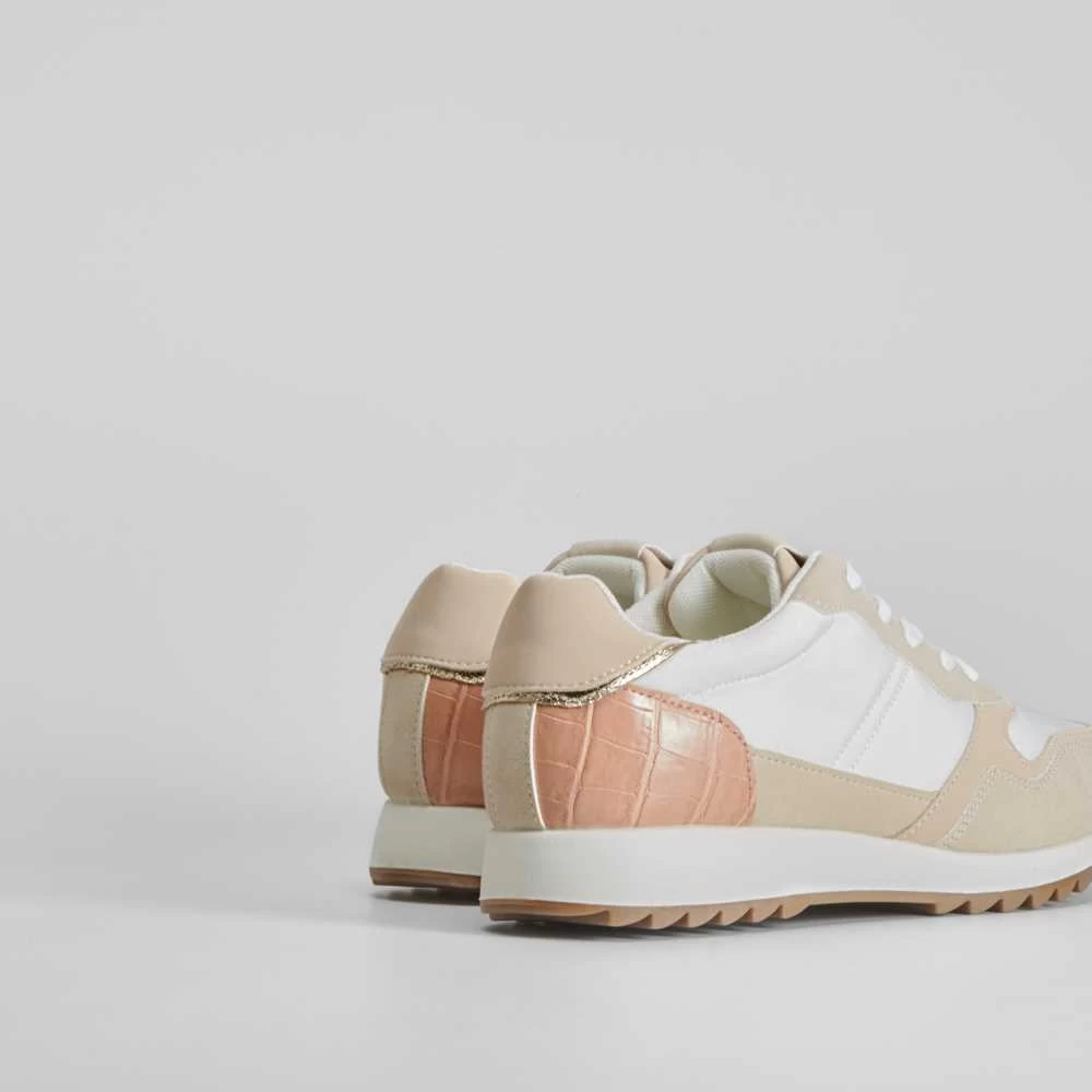 Zapatilla urbana retro jogger de PICCOLA PIU para mujer. Modelo en tonos blanco, rosa y beige con piezas superpuestas y talón grabado con grabado de cocodrilo.