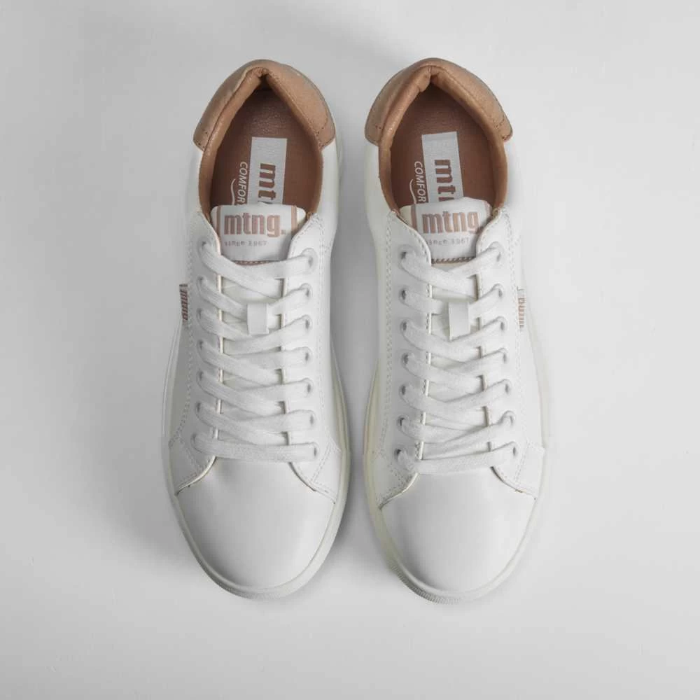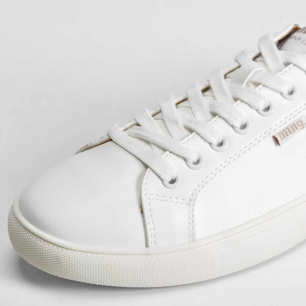Zapatilla de tenis blanca de MUSTANG con cierre de cordones y pieza marrón en el talón.