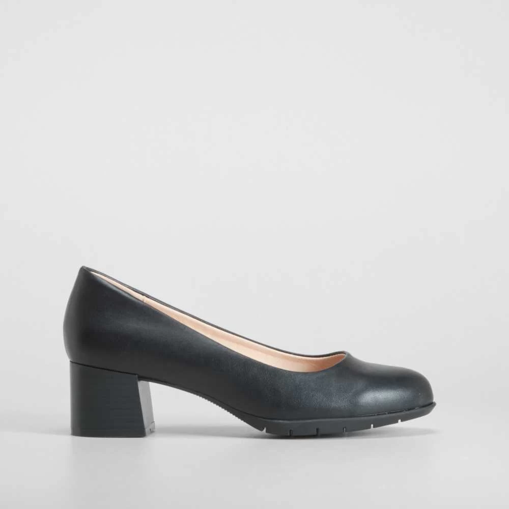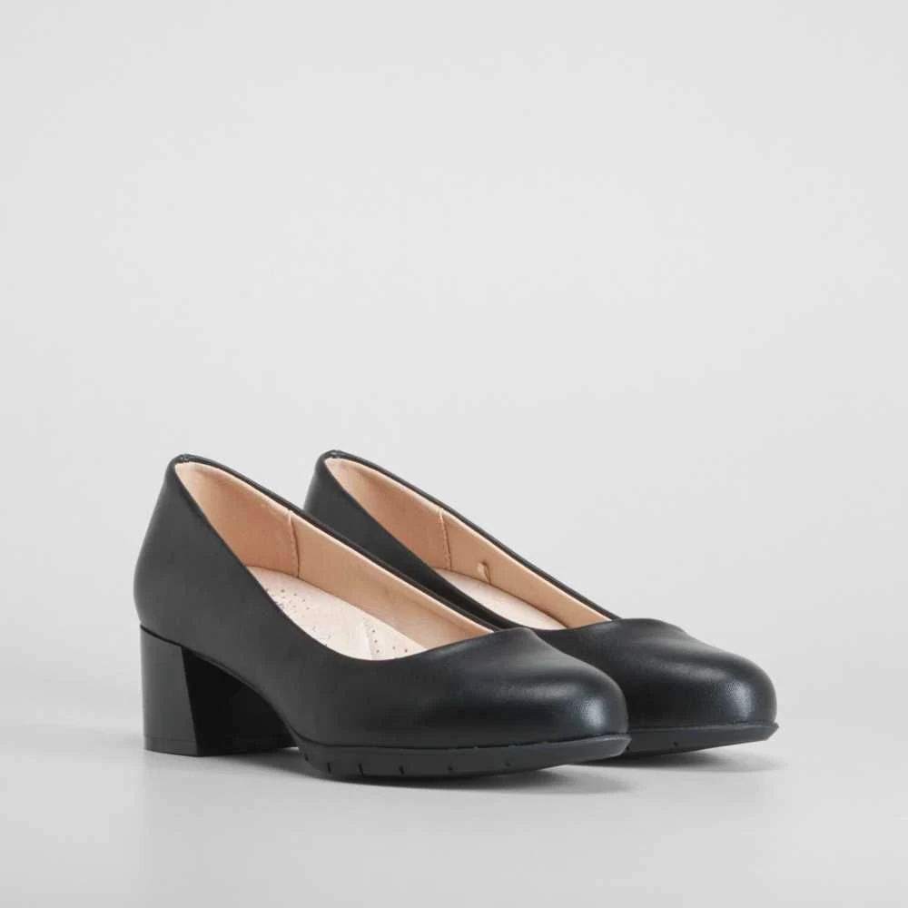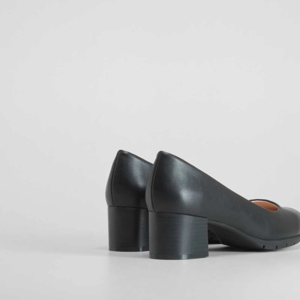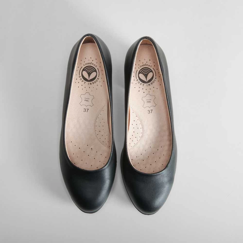 Zapato de salón clásico de horma ancha de la marca COMFEET para mujer. Modelo textil en color negro con un tacón cuadrado de 5cm de altura. COMFORT+ Incorpora una plantilla ergonómica termo conformada repartiendo el peso de manera uniforme y disminuyendo la presión.