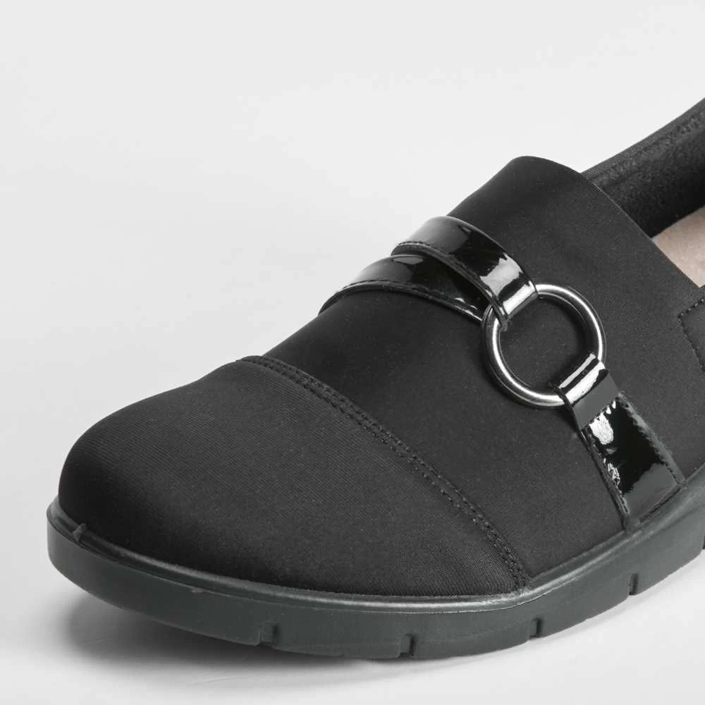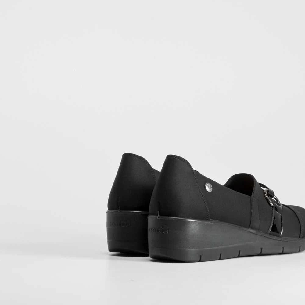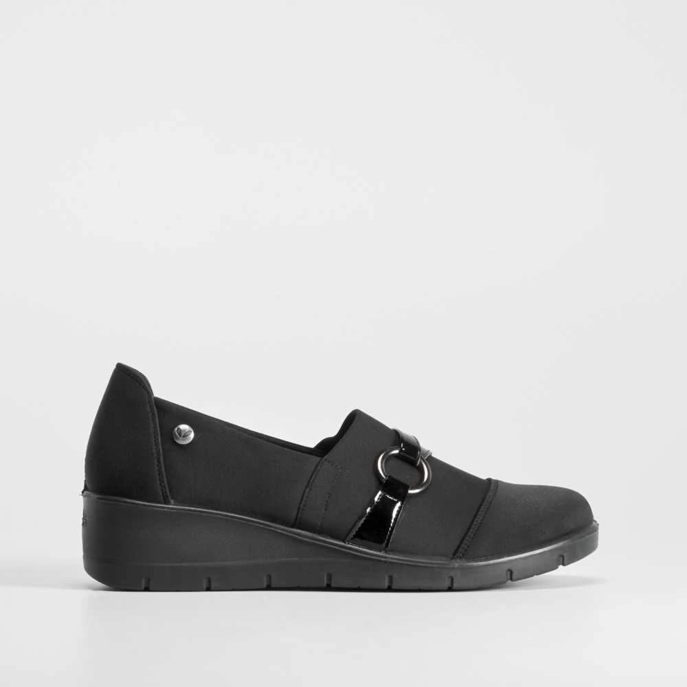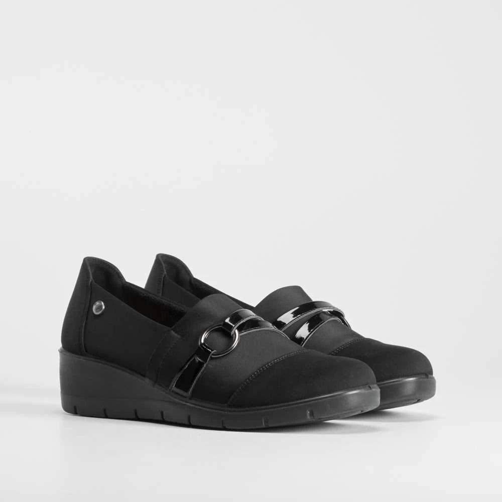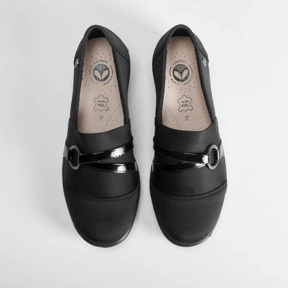 Zapato cuña argolla COMFEET de color negro para mujer. COMFORT+: Incorpora una plantilla ergonómica termoconformada que reparte el peso de manera uniforme y disminuye la presión aliviando así nuestros pies.