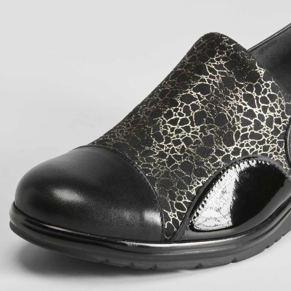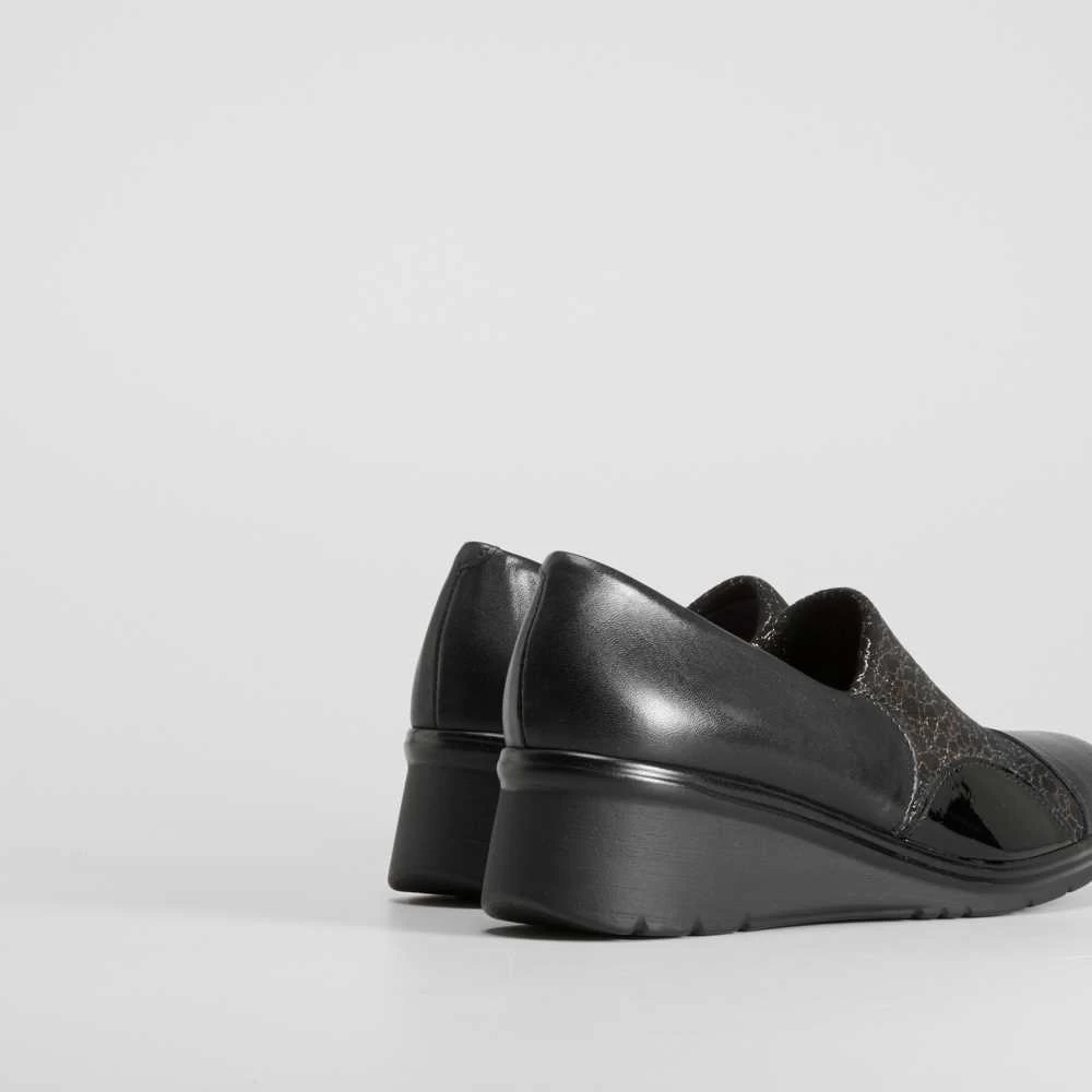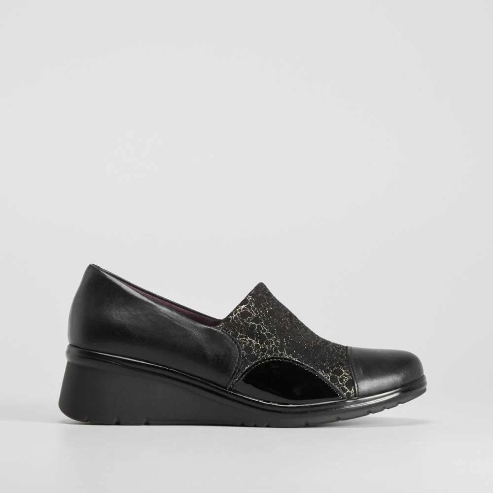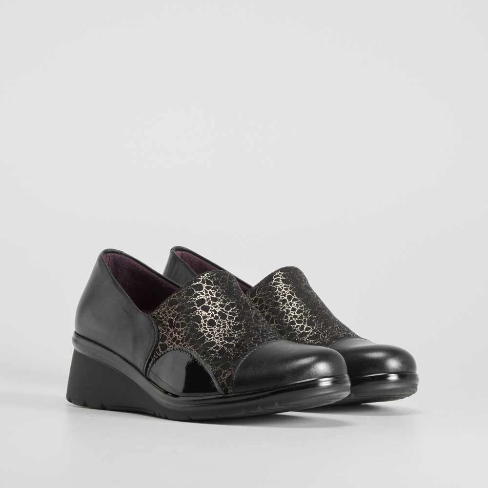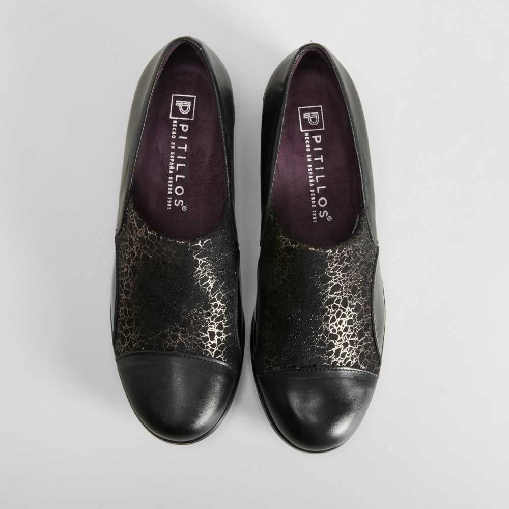 Zapato cerrado de piel de la marca PITILLOS para mujer. Modelo en color negro con detalles dorados. Cuña baja de 4cm de altura. Hecho en España.