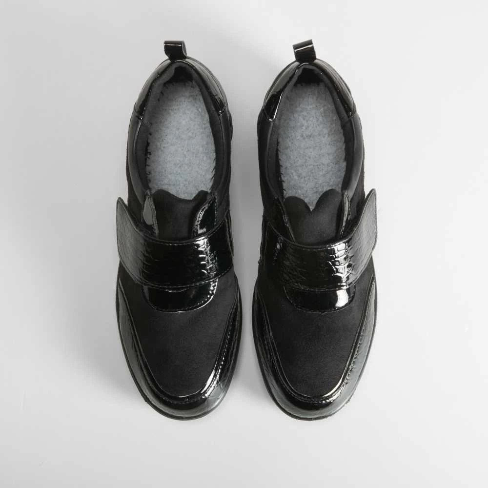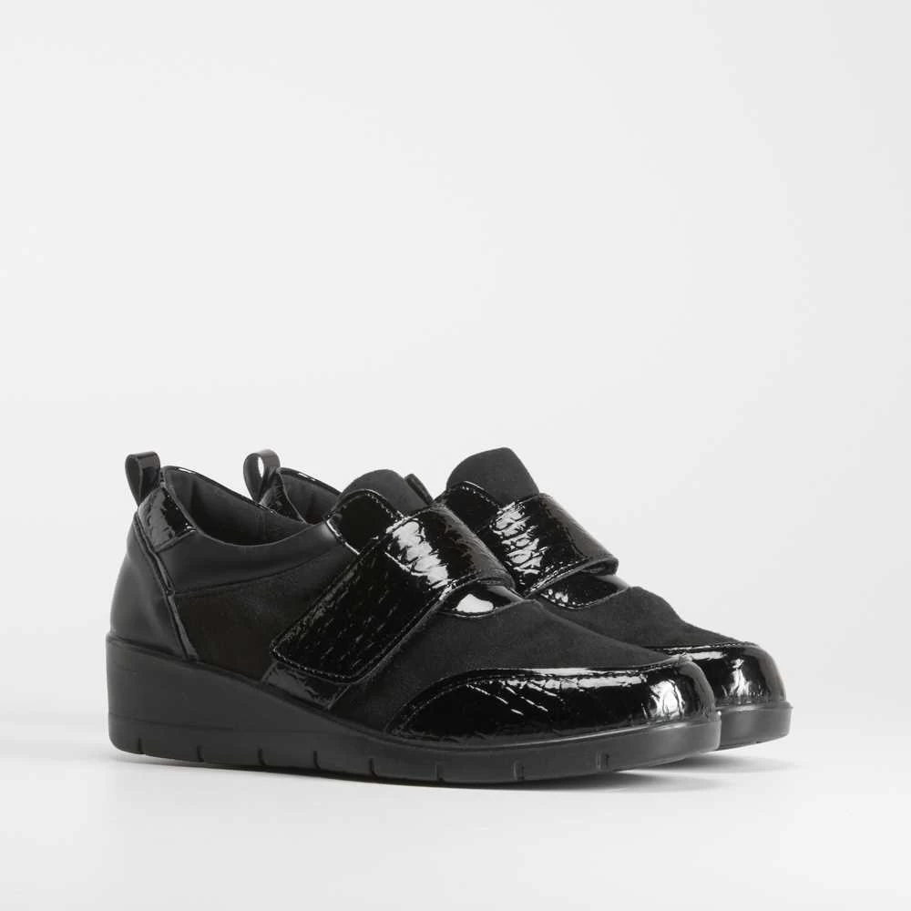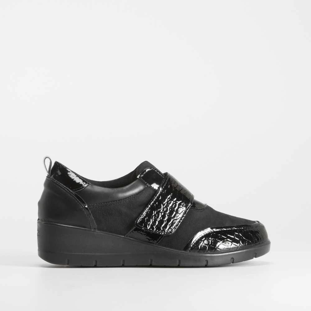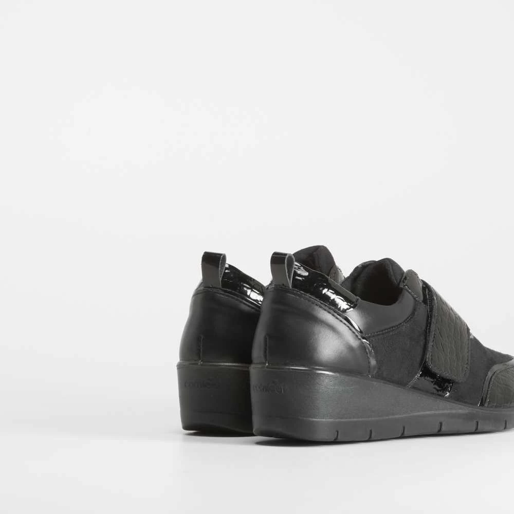 Zapato cerrado con cuña en color negro con detalles combinados en charol de la marca COMFEET. Diseño extra ancho para mayor comodidad. Tecnología Soft Insock: La plantilla se adapta a la forma natural del pie, aportando una sensación de bienestar al caminar