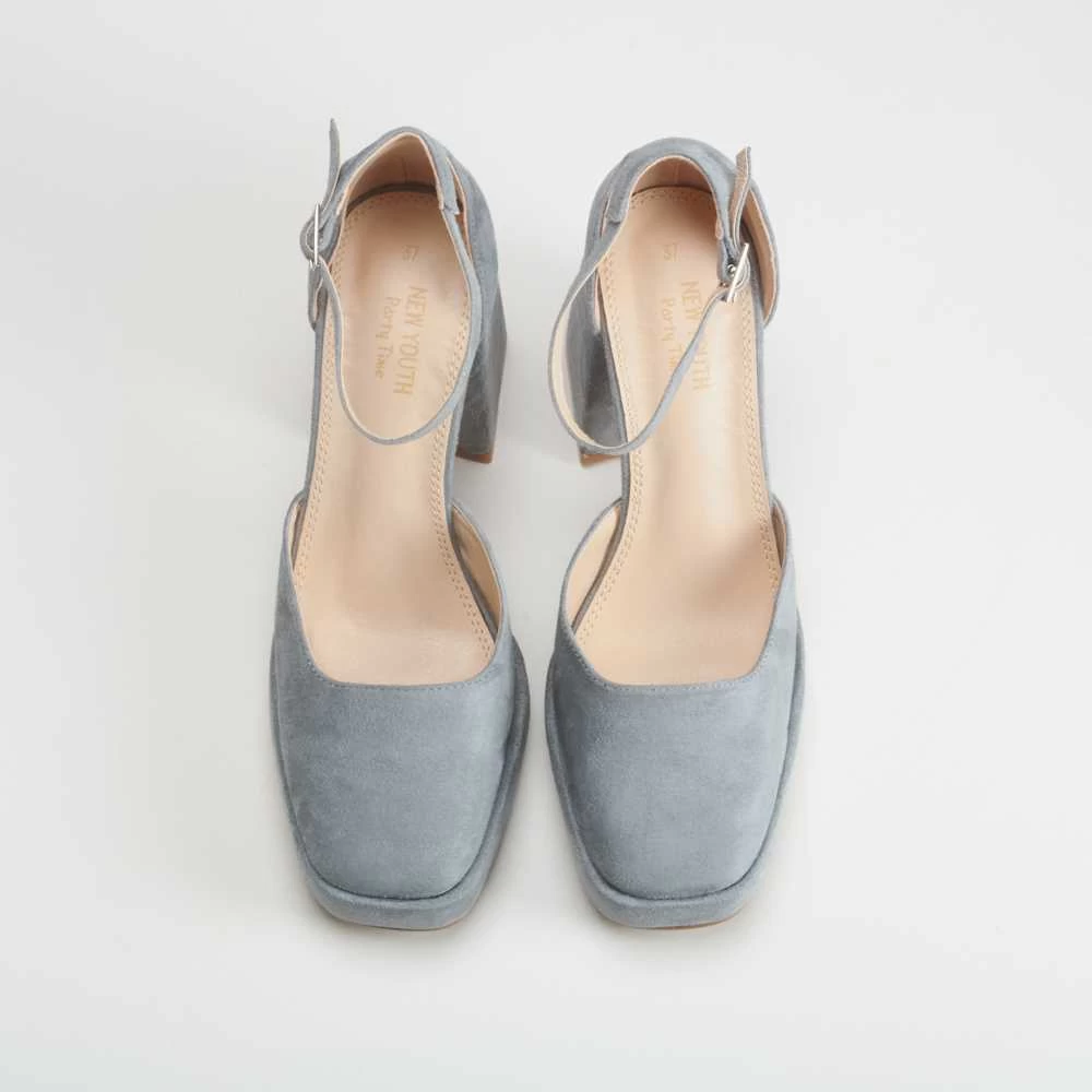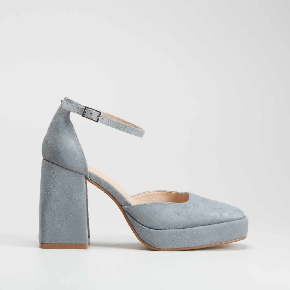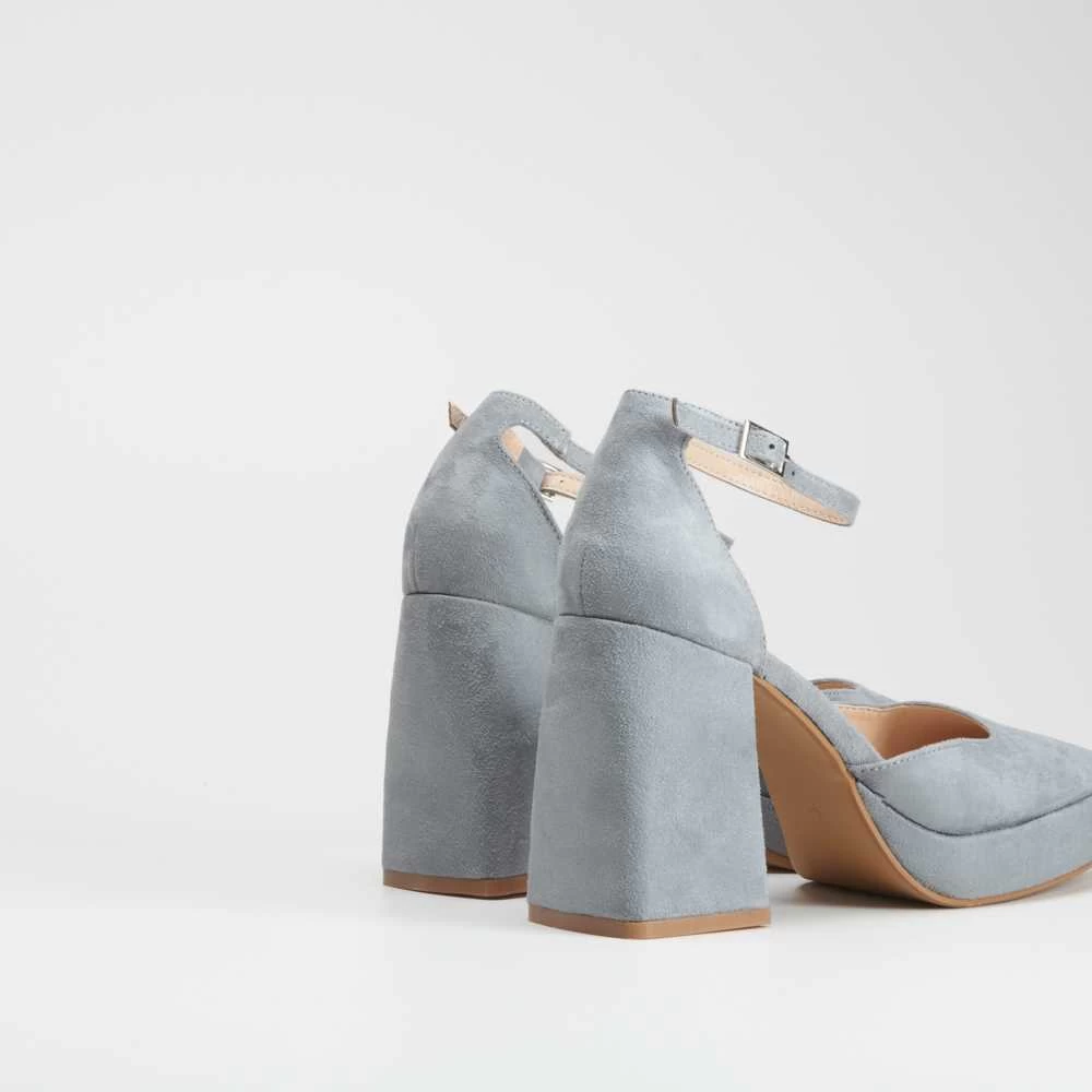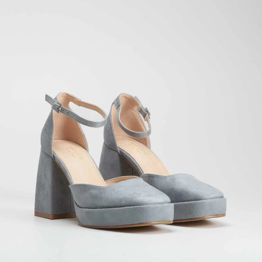 Zapato de tacón para mujer de la marca NYC. Modelo liso con pulsera y hebilla trasera ajustable en color gris. Suela con tacón cuadrado de 9 cm de altura.