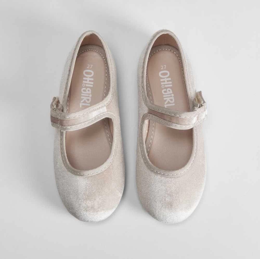 Zapato de terciopelo beige para niñas de la marca BACHE. Tira con velcro en el empeine para un buen ajuste.