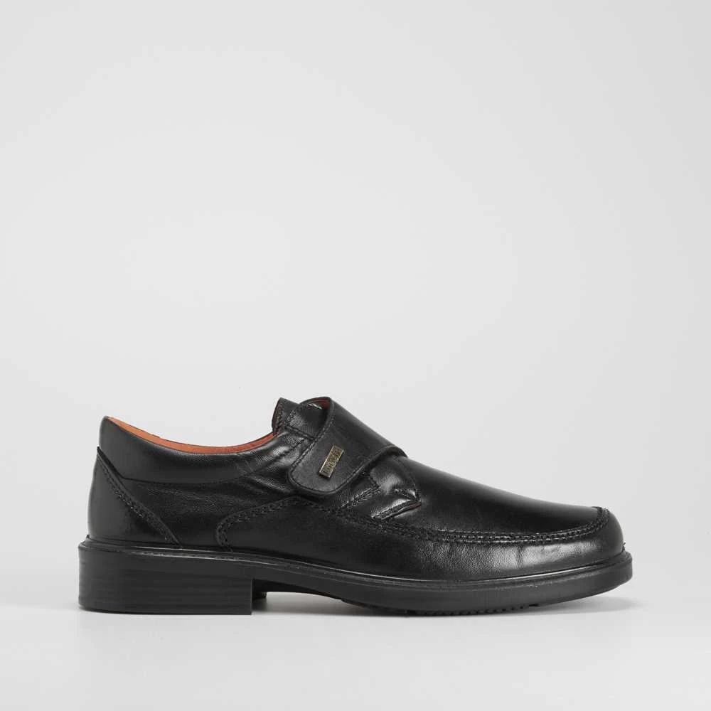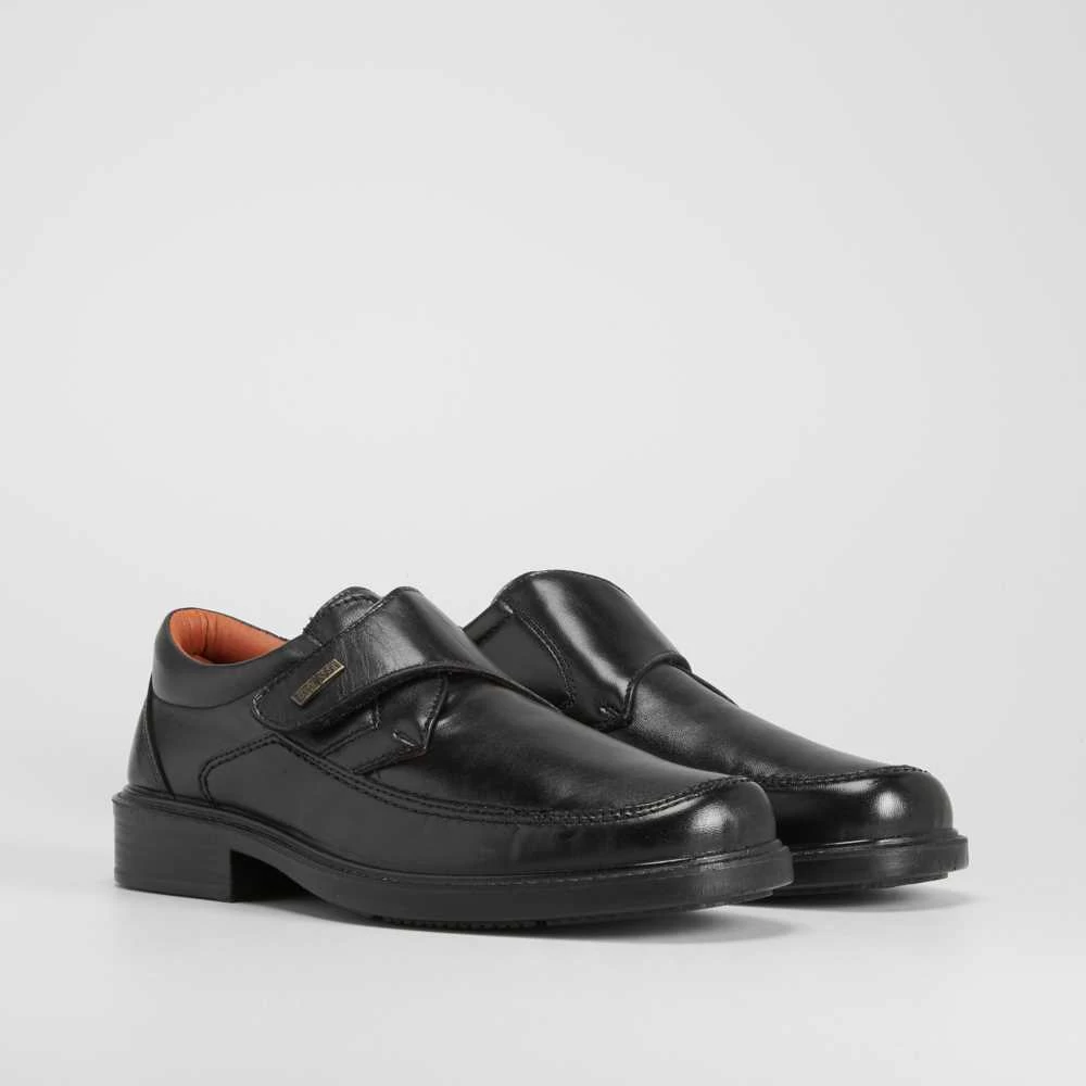 Zapato cómodo de vestir de la marca LUISETTI. Exterior de piel en color negro con una práctica tira de velcro para un buen ajuste. Plantilla de ancho especial muy agradable.