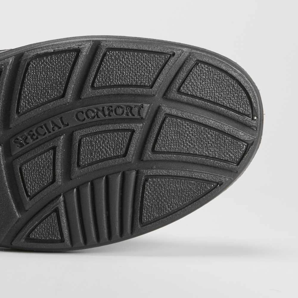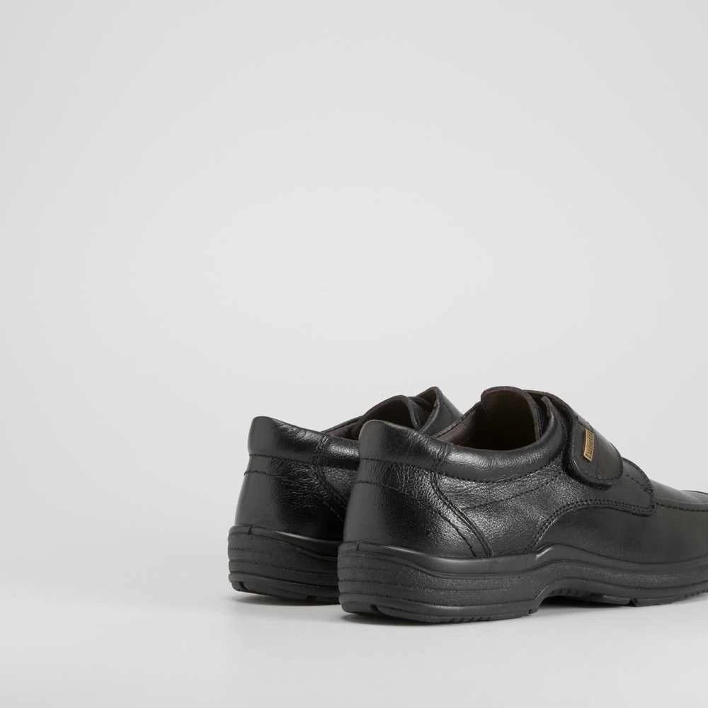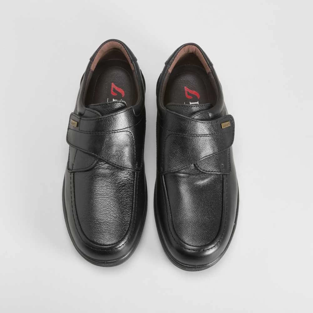 Zapato confortable para hombre de la marca LUISETTI. Corte de piel en color negro con un acabado flexible y ligero para mayor comodidad. Tira de velcro para un calce rápido. Planta de ancho especial.