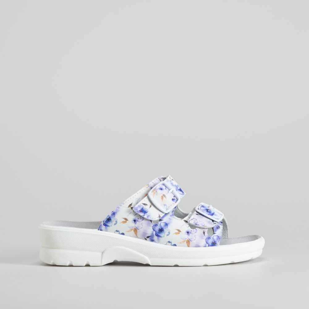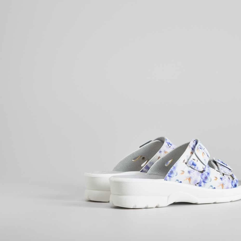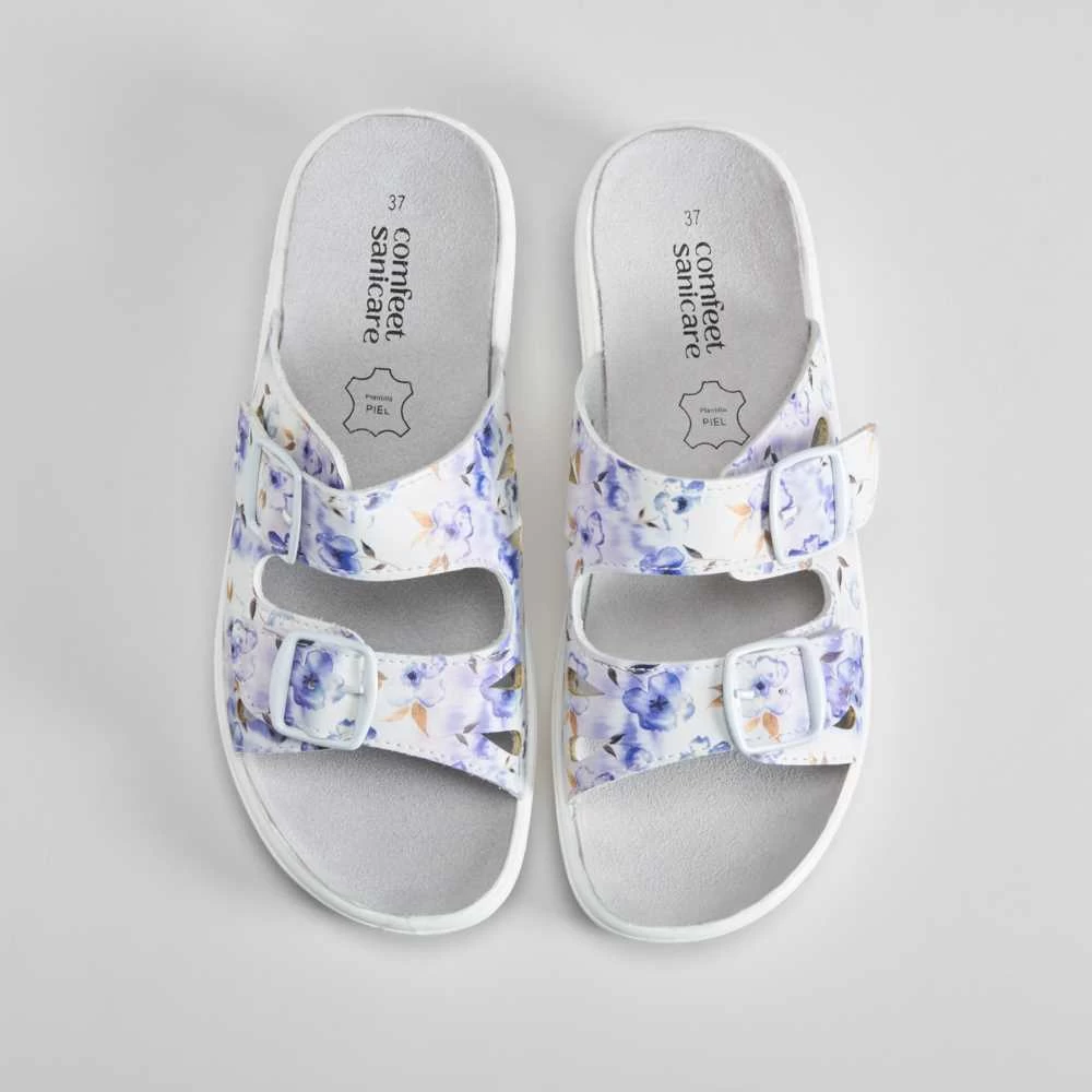 Zueco de enfermera abierto con hebillas de la marca COMFEET SANICARE. Modelo en color blanco con estampado de flores y dos hebillas ajustables.